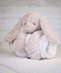 Light Brown soft plush rabbit. Contrast cream corduroy under ears and on paws. Hook and loop fastening on paws. Separate cream blanket in microfleece with contrast blanket stitching on edge. Delivered in a presentation bag with cream ribbon. Remove all hang tags and their fasteners before giving these items to a child. Suitable for children of all ages. Complies with EN71 European Toy Safety Regulations.