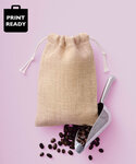100% Jute, 300gsm. Double drawcord closure. Natural ties.